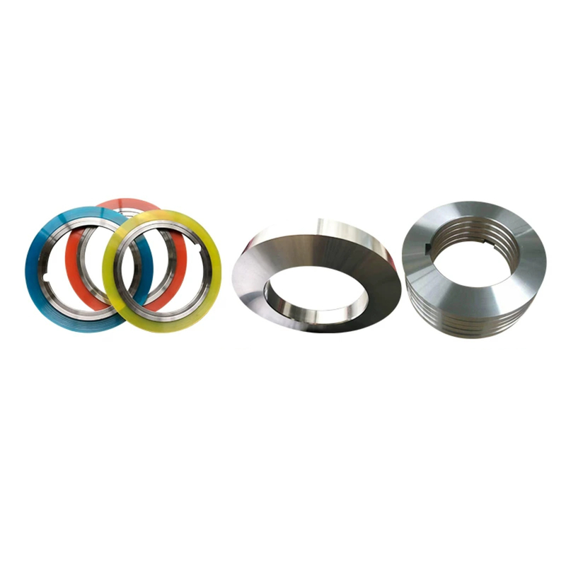 为了调节叶片之间的间距和上下叶片之间的间隙,通常设有垫片和橡胶垫片。间隔物的厚度根据所需的分切宽度来选择。常用的厚度范围在0.8-200mm之间,其硬度一般在HRC45以上,以防止划伤和损坏。